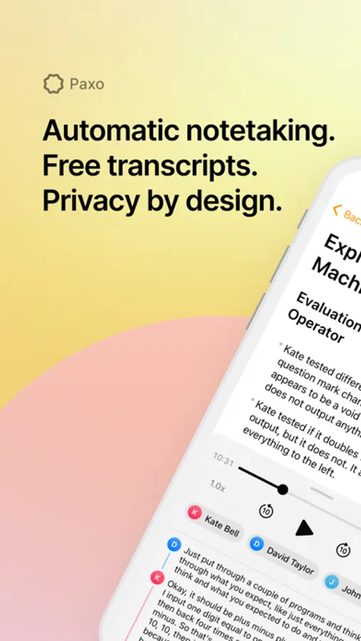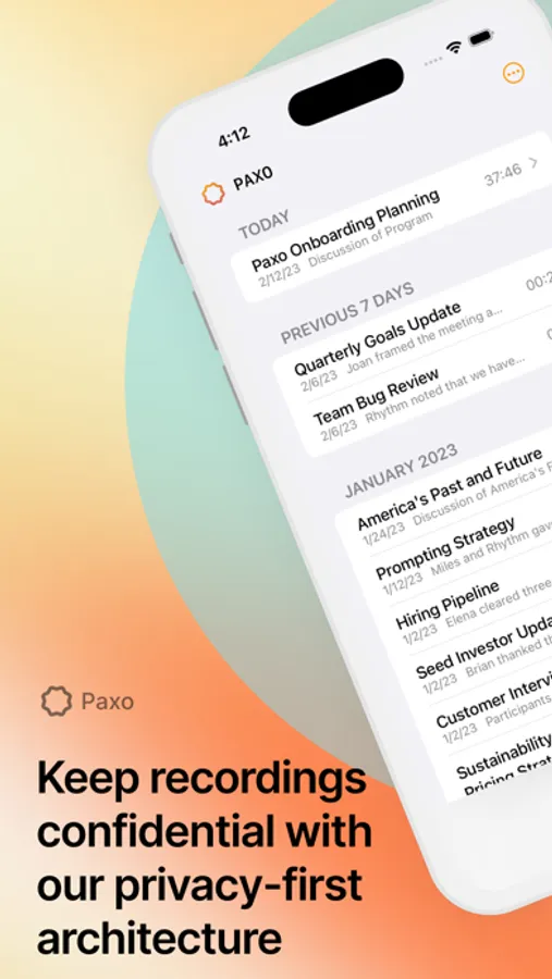 Paxo is architected from the ground up for privacy. We store your recordings on device — not in our cloud. We delete your recordings from our servers as soon as we're done processing them.