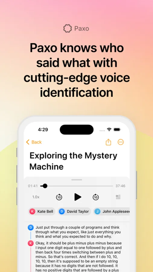 - Speaker identification: Paxo uses cutting-edge voice processing to distinguish between speakers in your meetings. Conveniently assign speakers using your Contacts, and Paxo will learn their voices and recommend speaker assignments for future recordings. After assigning speakers, the transcript and notes will update in real-time to reflect speaker names.