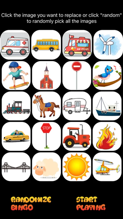 Car bingo has over 60 available images you can use to build your custom bingo board