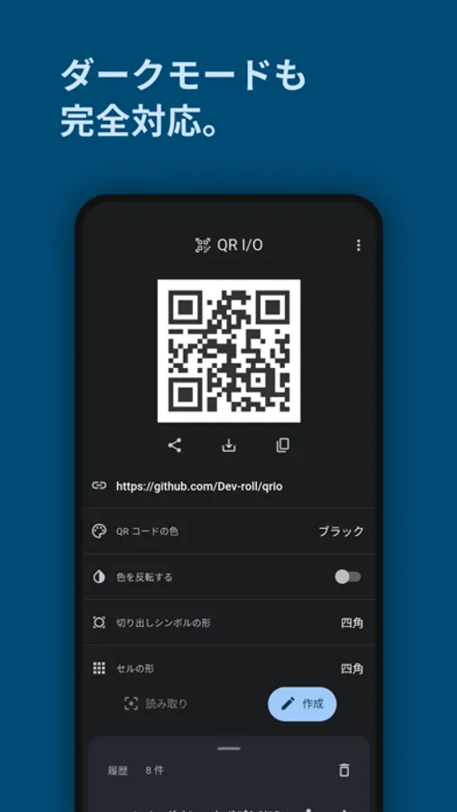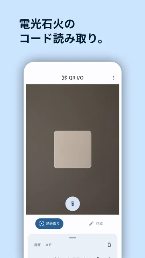QR I/O なら、QR コードや バーコードなどのコード読み取りと QR コードの作成をシームレスに 1 つのアプリで実現できます。