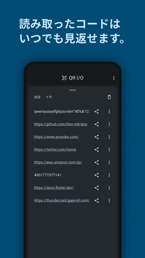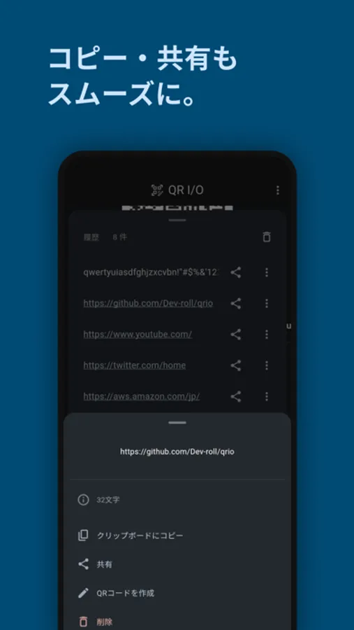 ● 読み取ったリンクの履歴から、リンクの共有や QR コードの新規作成も可能