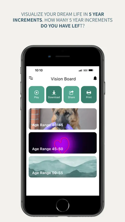 The Inspired Vision app will take users through a self-discovery process that will inspire them to make lifestyle changes that will help them to achieve their dream life. The mobile app will allow users to create a vision board and be able to play it as a slide show of photo collage. The app would also allow its users to create Ideal Days. The user will be able to set a notification time for both their vision board and Ideal Days. Additional functionality for the user will include the ability to download a vision poster for each of their vision items.