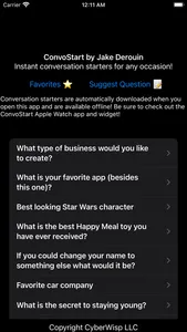 Awkward silence begone! ConvoStart has conversation starters for any occasion! Whether you are having a date night with the person of your dreams or attending family get together, nothing brings people closer than great conversation. With over 250 unique prompts and NO in app purchases, ConvoStart can bring interesting conversation to even the most boring of gatherings. Say goodbye to awkward silence and hello to fun and interesting topics!