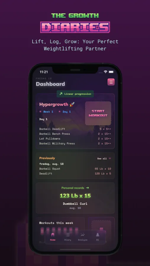 Unleash your inner beast and crush your weight-lifting goals with The Growth Diaries! With lightning-fast workout tracking, you'll never miss a beat. Visualize your progress and see your gains come to life with detailed workout analysis, metrics, and dashboards. Impress yourself with how much you're growing every week.