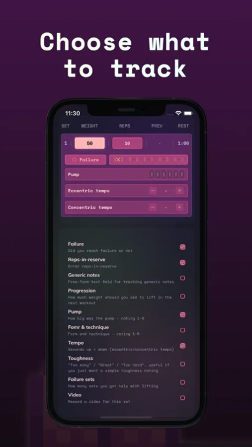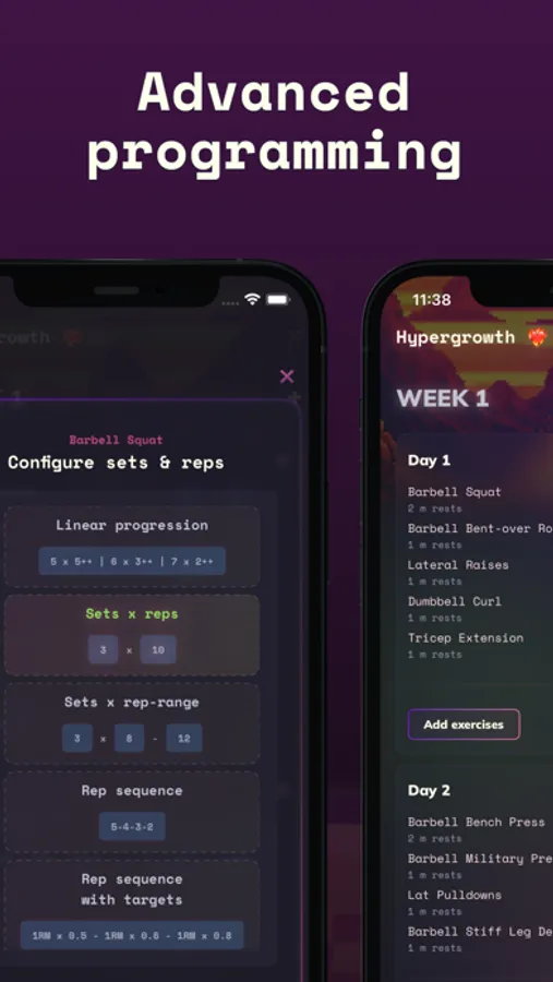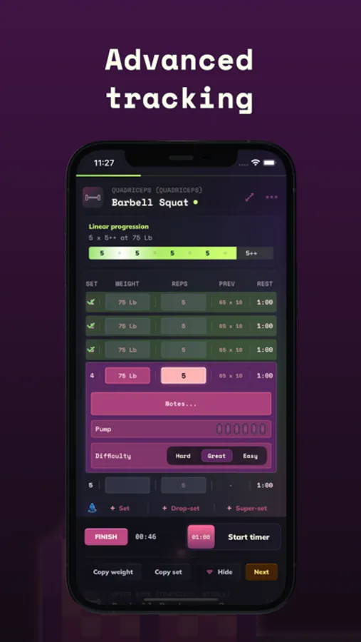 * Advanced set-tracking with metrics such as reps-in-reserve, failure sets, super-sets, drop-sets, giant-sets, notes, reps and weight.