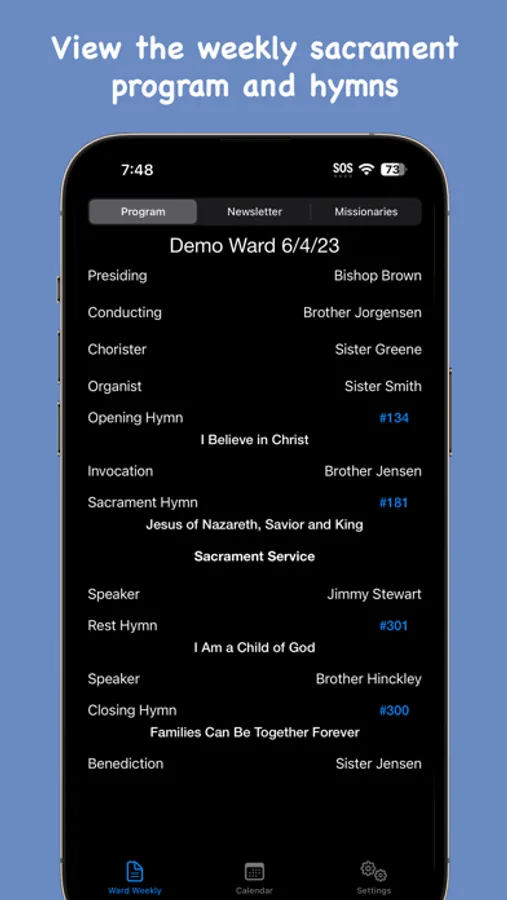 Prepare for each worship service with ease by viewing the weekly ward program. Browse through the order of service, hymn selections, and speaker lineup, ensuring you're ready to fully engage in the spiritual experience. Our app makes it simple to follow along and participate meaningfully in every gathering.