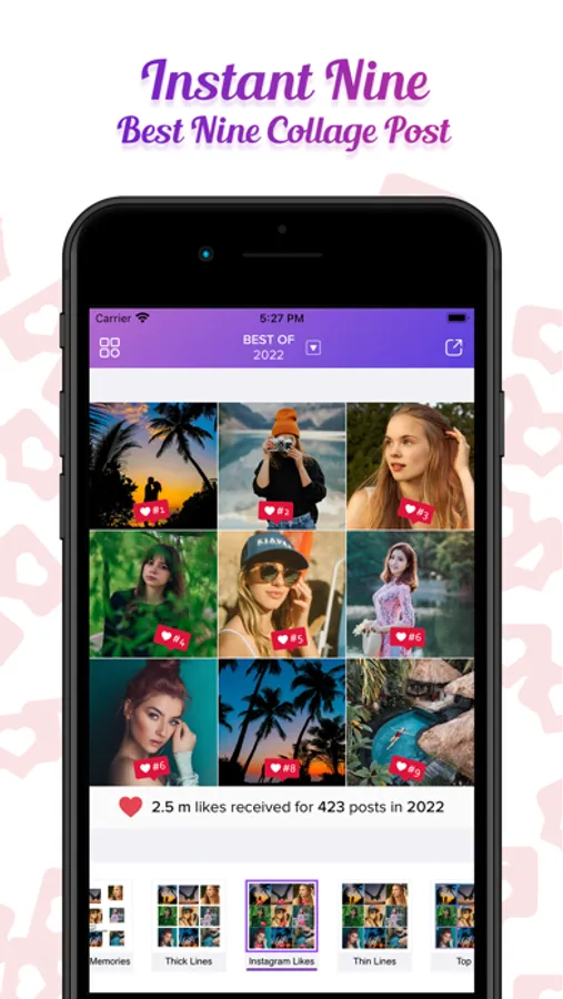 Instant Nine - Top Nine 2022 will get to work generating a collage with your most successful photos or videos. And to top it all off, in the lower part of the composition, you'll see the total number of likes received and the number of total post across the year.