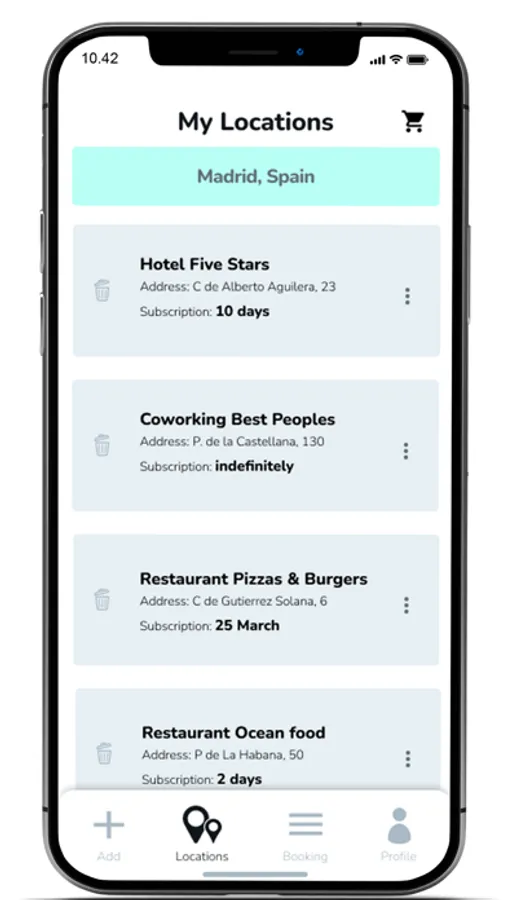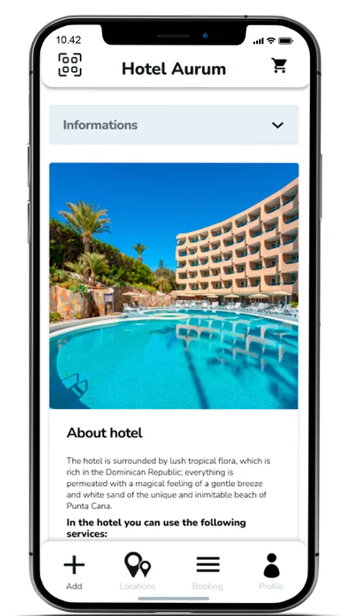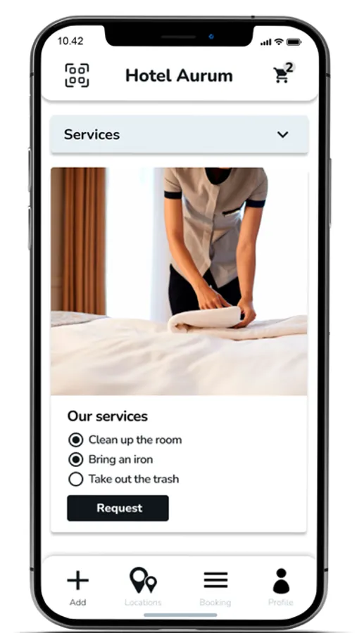 Now you have access to all the services that you can use in this location. Order pizza in a hotel room or call a maid, find an airport transfer, choose a delicious breakfast in a restaurant with the right additions, or book a meeting room in a coworking space. All information in your language, the ability to buy, book, reserve, request or review.