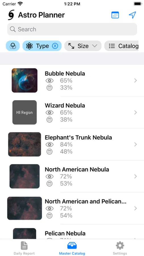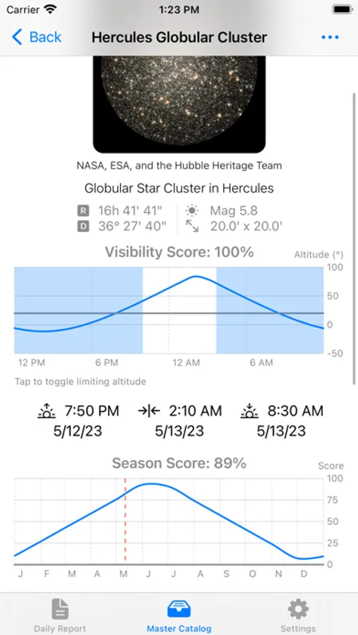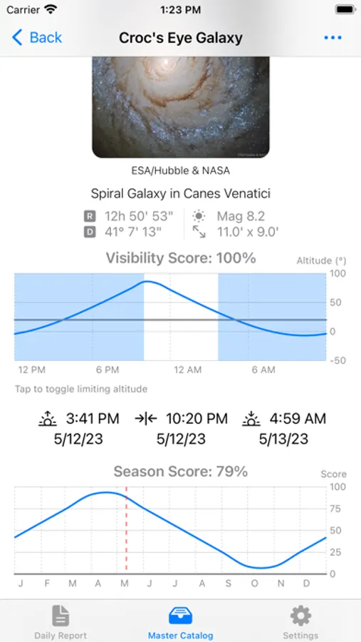 The core idea behind this app is to make it easy for astrophotographers to filter through a catalog of deep sky targets or use an algorithm that chooses the best target for a given night. Each target has a calculated visibility score that measures what percentage of the night the target is visible for and a season score that measures how close the target is to its opposition from the sun. The algorithm makes use of both of these scores and information about the moon in order to present the user a list of possible targets to image. Choose any date or location to get information for.