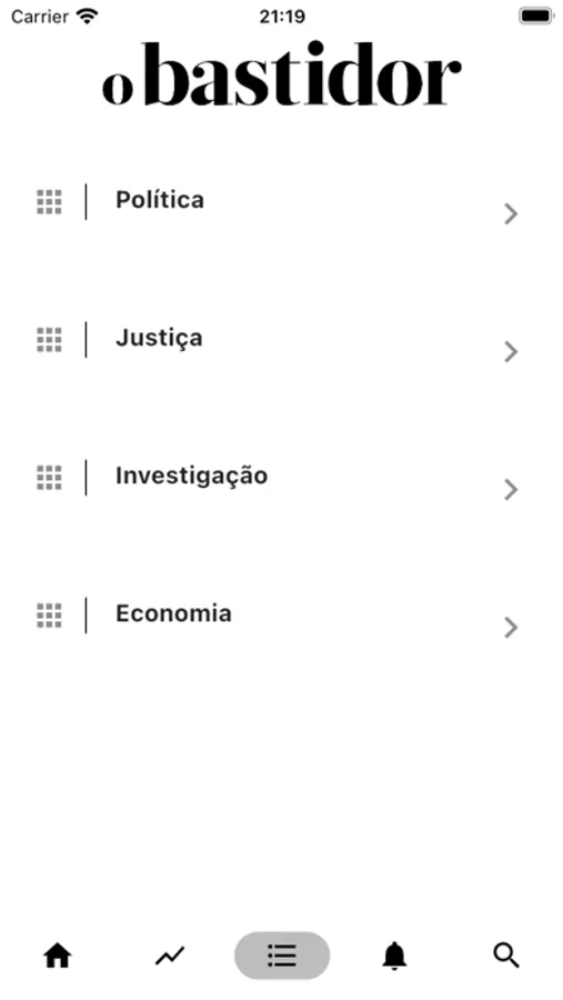 * Escolha por editorias, como Política, Justiça, Economia e Investigação.