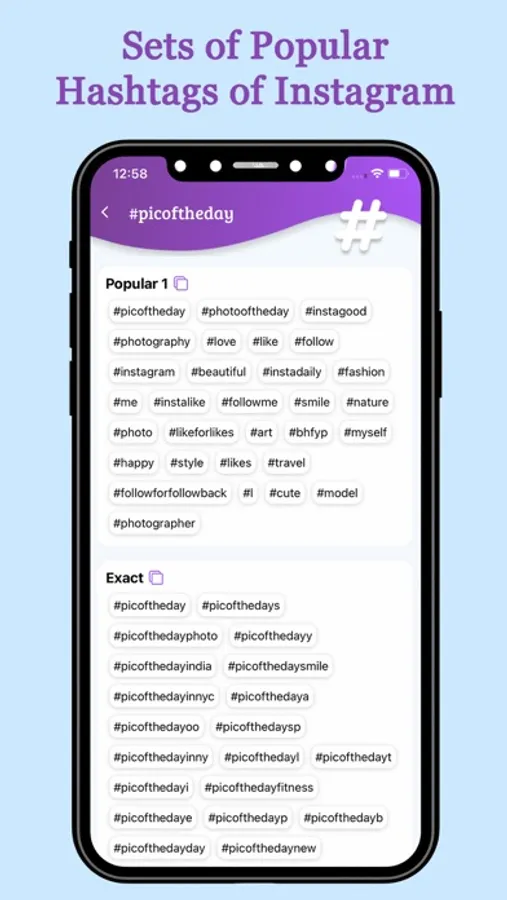 The app provides the hashtags for promotion in depend on frequency usage in 6 different sets Popular 1, Popular 2, Professional, Medium sized, Easy and Exact. Many experts use the combination of trending hashtags for Instagram and TikTok in order to get more likes and followers for their brands.