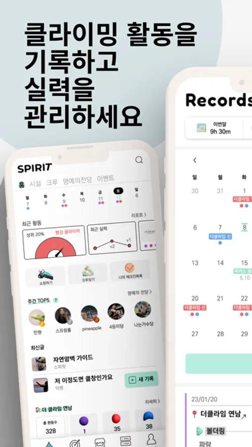스피릿은 활동에 대한 분석을 바탕으로 내 위치와 실력을 파악하고 비교할 수 있는 클라이밍 기록 서비스입니다.