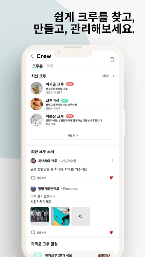- 쉽게 크루를 찾고, 만들고, 관리해보세요.