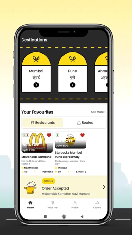 Yellow Eats allows you to discover pit stops with unique facilities for your upcoming road trip / highway journey/ bike rides /weekend getaway/ tour and travel through Indian highways/ highway roads and routes.. You can also pre-book your meals to save a lot of time or avail exclusive deals for dining-in. Welcome to an all-new highway dining experience!
