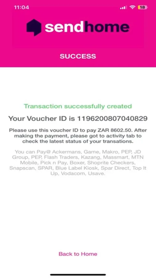 SendHome enables legal migrants to send money from South Africa to Zimbabwe, in a quick, secure, and dependable way. SendHome provides electronic self-registration and KYC. It has affordable transaction fees. Pay-in is available through Card, EFT, Zapper, Snapscan or using Cash at thousands of retail outlets in South Africa. Pay-out partners covering rural and urban centres in Zimbabwe include CABS bank branches and ZIMPOST Post Offices.