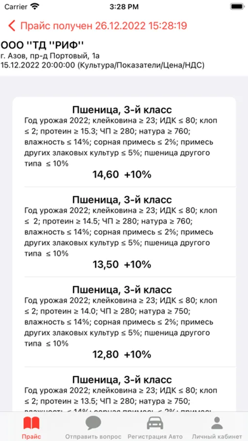 Торговый Дом «РИФ» осуществляет закупку и продажу сельскохозяйственной продукции на внутреннем рынке России и экспорта в страны ближнего и дальнего зарубежья. В этом приложении актуальные закупочные цены на пшеницу, ячмень, кукурузу, горох. Вы сможете увидеть всю необходимую информацию по элеваторам и получать изменения цен. Прием товара на элеваторе, обработка документов, отправка груза за рубеж происходит быстро, что давно уже оценили многие фермерские и крестьянские хозяйства - поставщики зерна и сельхозпродукции.