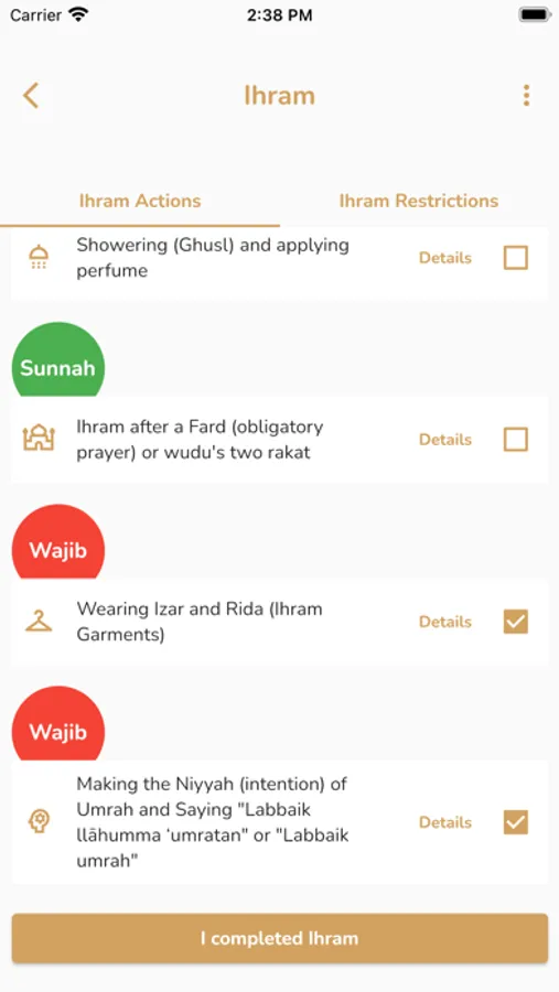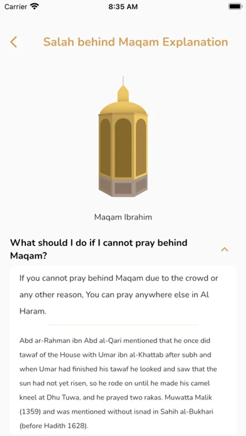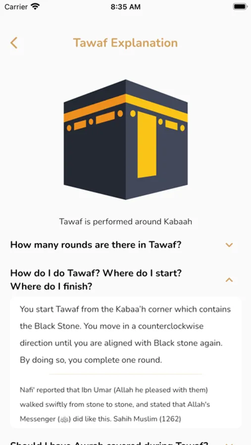 Umrah Tracker guides you in performing umrah at every stage of the ritual with checklists and counters. It ensures that you remain on track and do not miss important steps. For tawaf and sa’i, there is a counter to show your progress, thus minimizing the possibility of losing the count of the rounds.