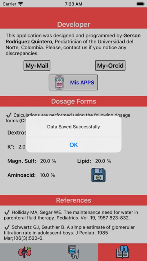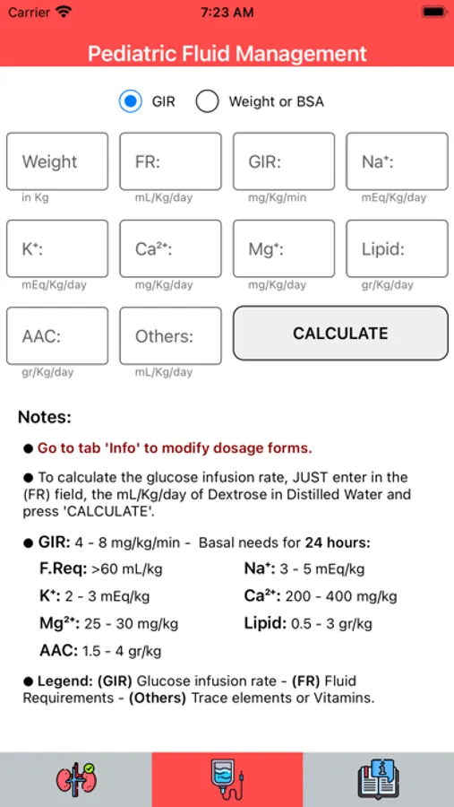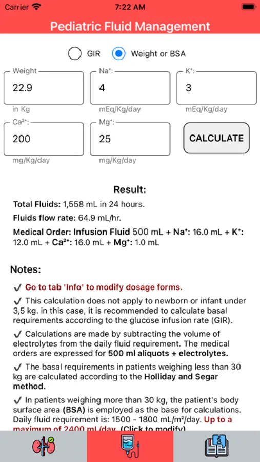 » The app calculates daily hydrocaloric and electrolyte requirements for pediatric patients, following the Holliday and Segar method or considering body surface area.