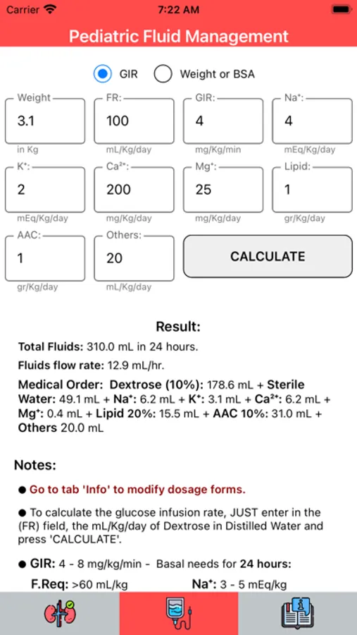 » It also calculates daily hydrocaloric, electrolyte, and other requirements for Neonatal Parenteral Nutrition, taking into account glucose infusion rates and daily fluid needs.