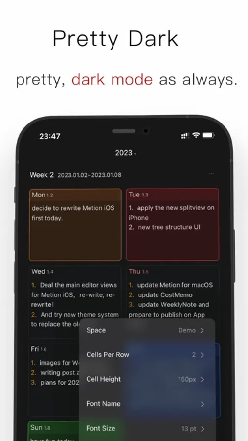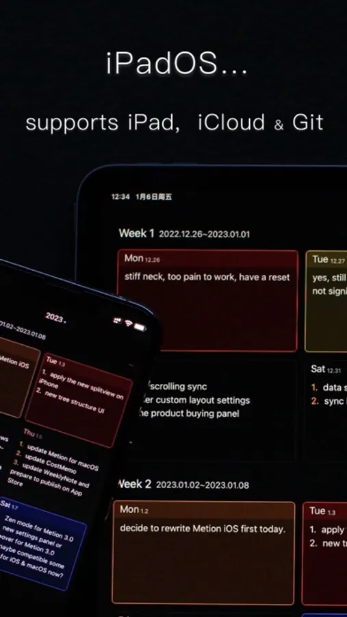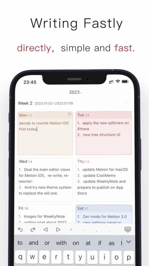 All the recording and writing is done in one screen only, and the 365 days of the year are visualized in "per week" units. You can see everything at a glance, select a day, and start writing directly.