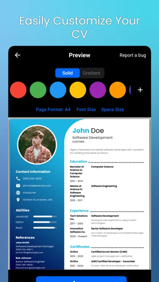 Whether you're a recent graduate embarking on your professional journey or an established professional seeking career advancement, Resume Builder | PDF CV Maker empowers you to present your credentials confidently and professionally. Our app's advanced features, combined with the flexibility of customization, enable you to create a resume that accurately reflects your skills, experiences, and aspirations.