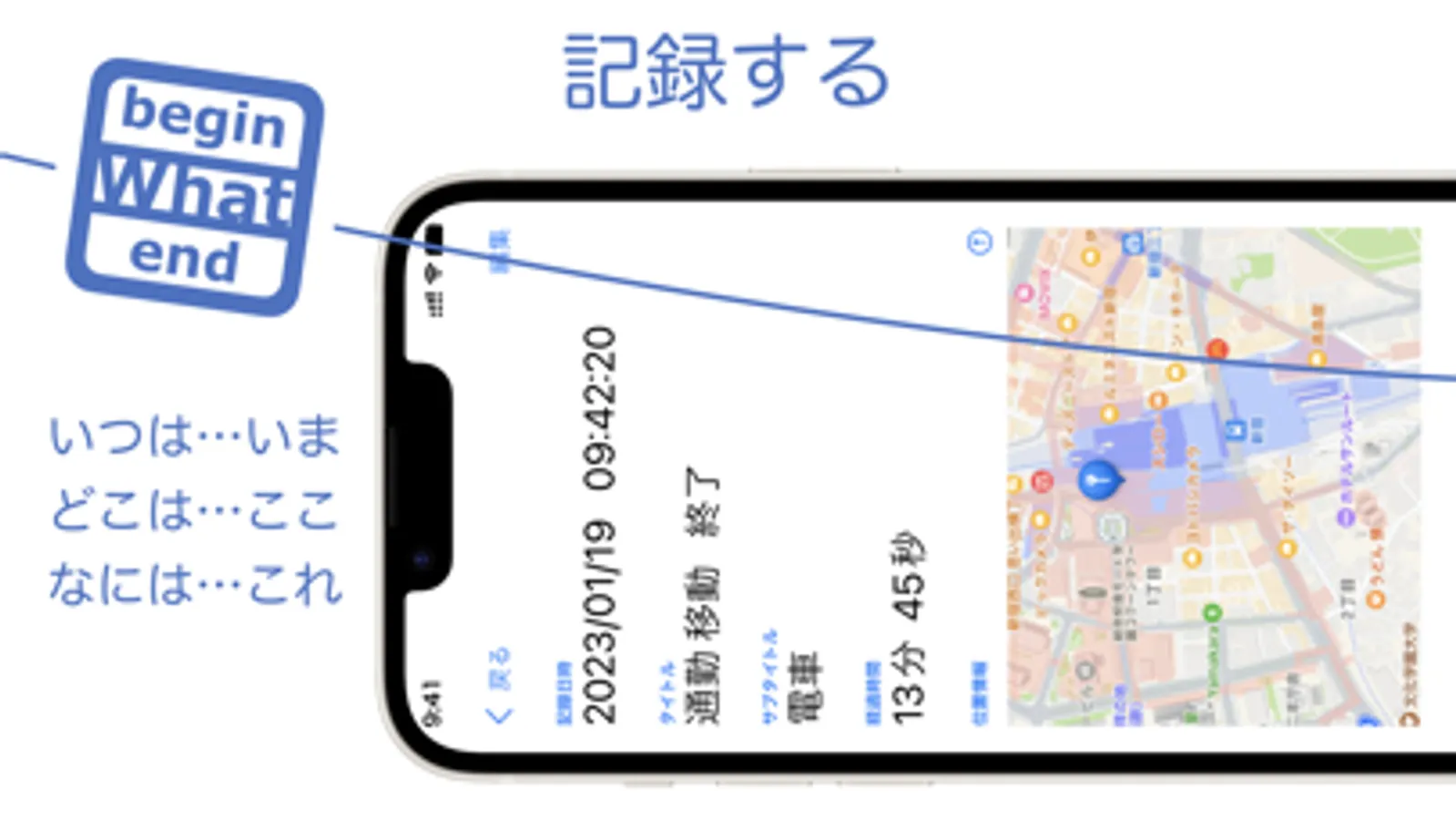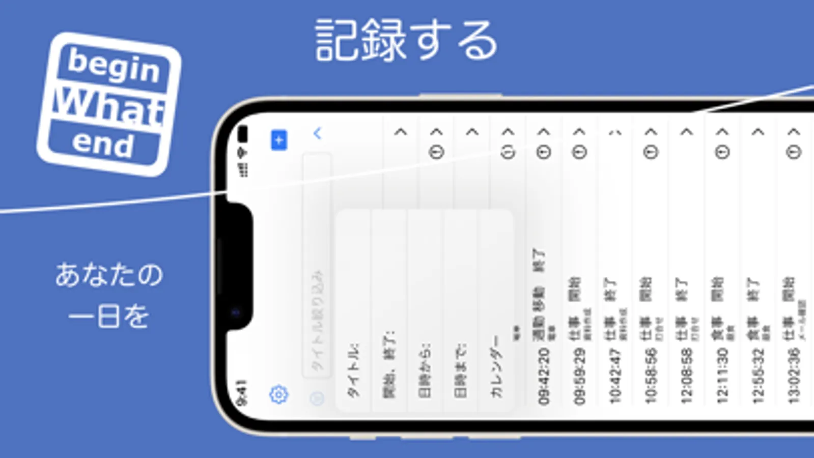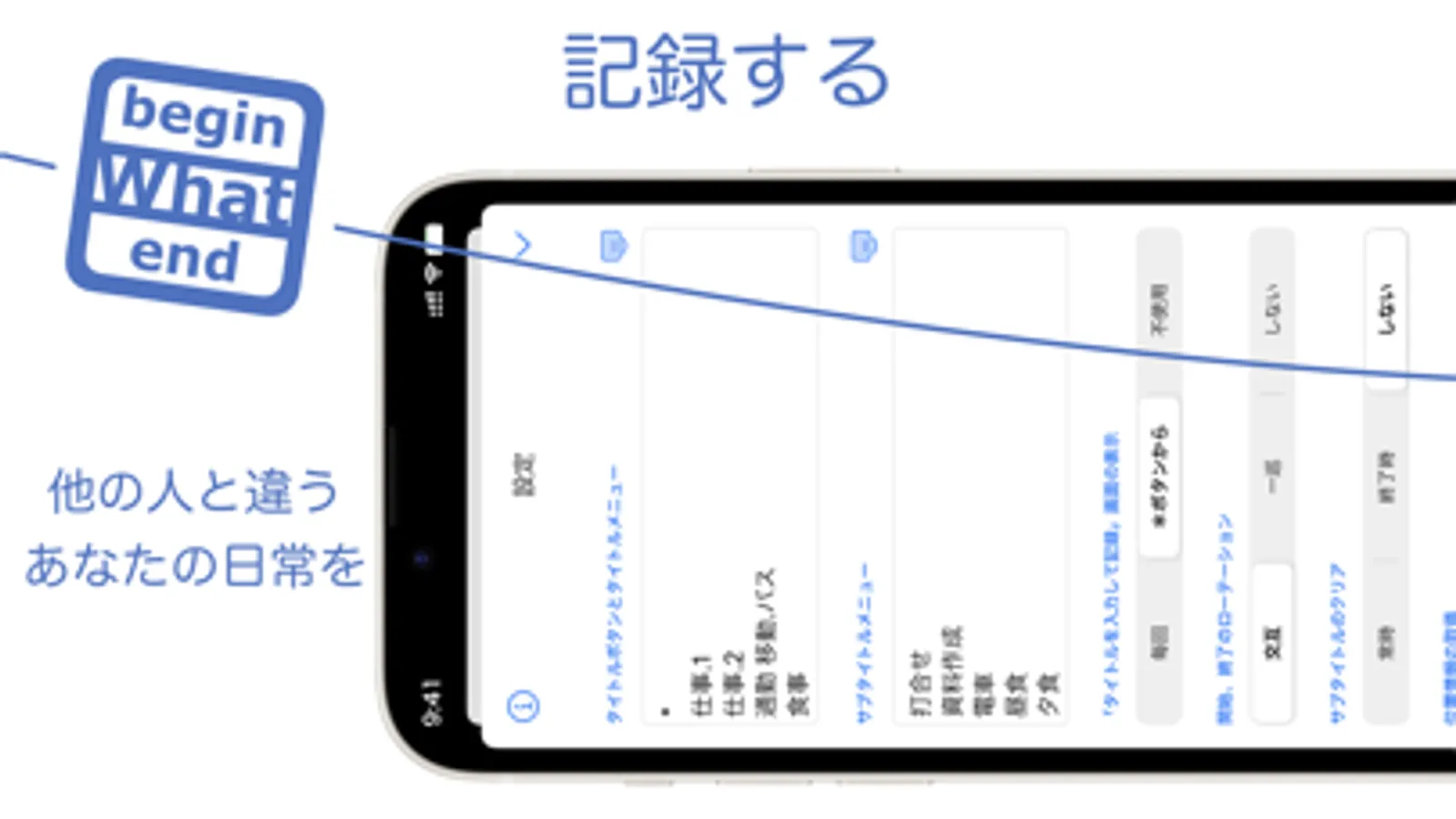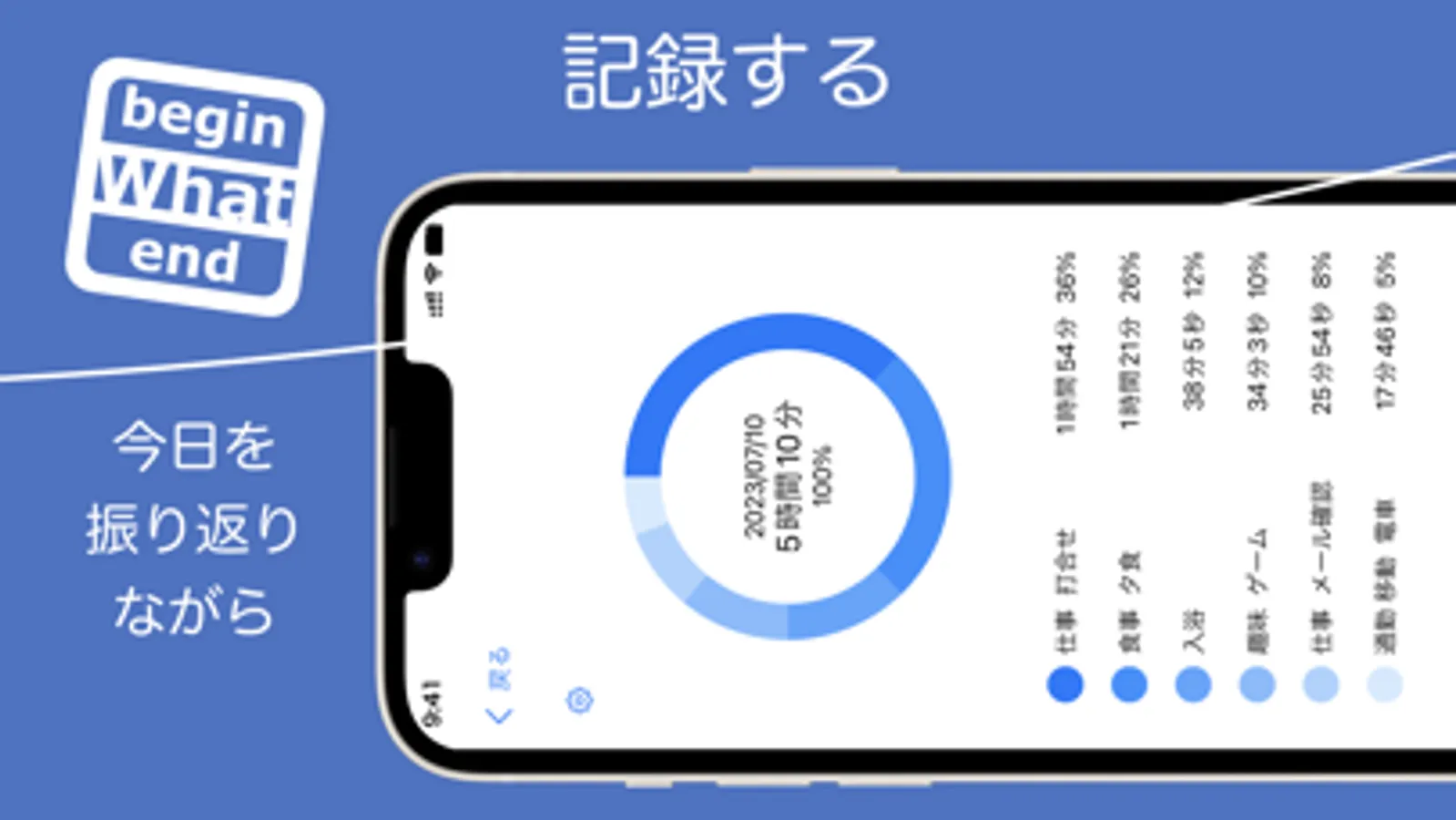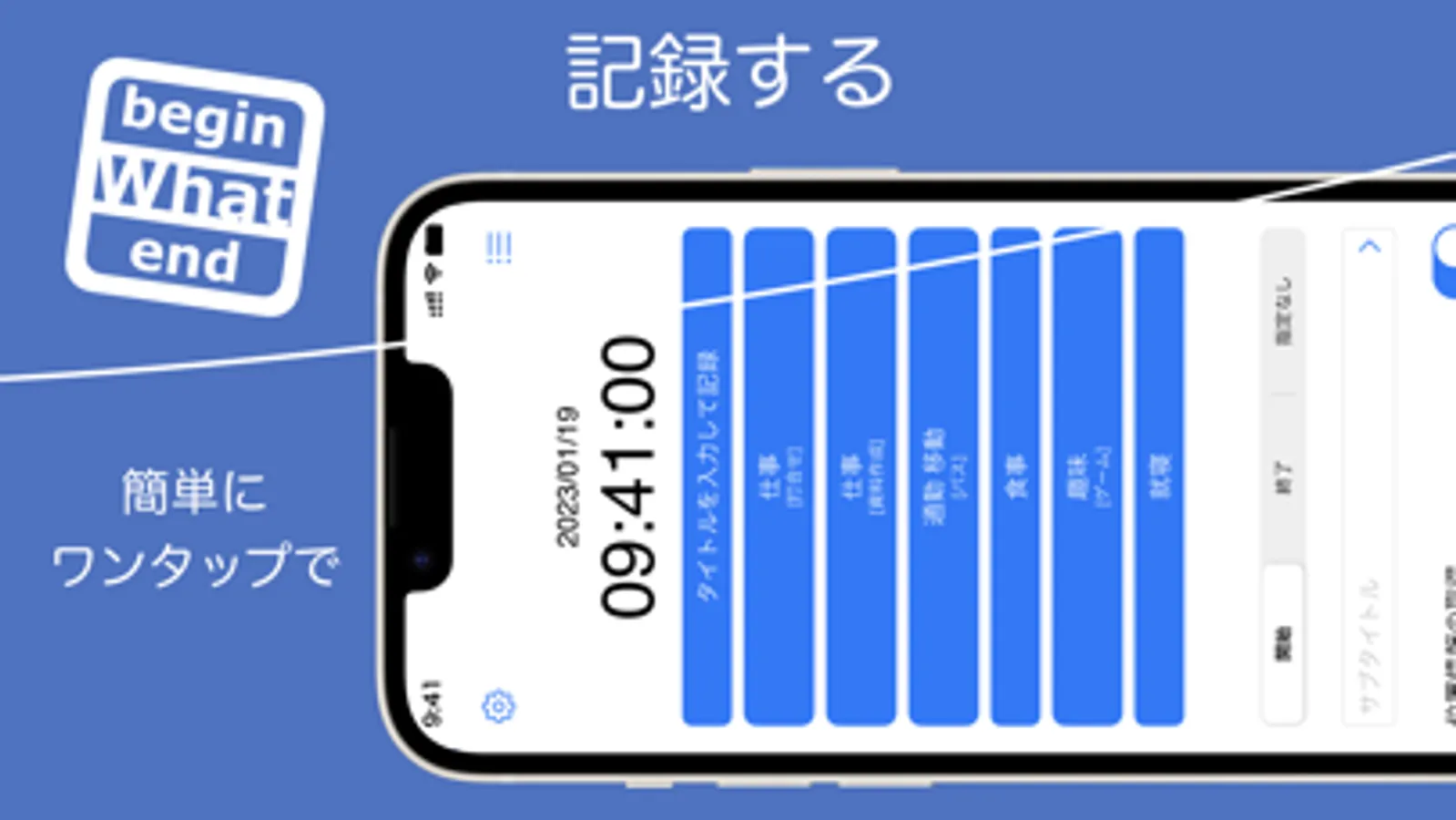 「仕事」の「打合せ」、「仕事」の「資料作成」など、2つの要素の組み合わせで内容を記録します。