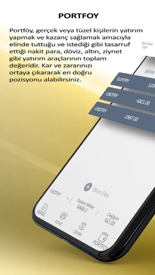 Portföy, gerçek veya tüzel kişilerin yatırım yapmak ve kazanç sağlamak amacıyla elinde tuttuğu ve istediği gibi tasarruf ettiği nakit para, döviz, altın, ziynet gibi yatırım araçlarının toplam değeridir. Kar ve zararınızı ortaya çıkararak en doğru pozisyonu alabilirsiniz.