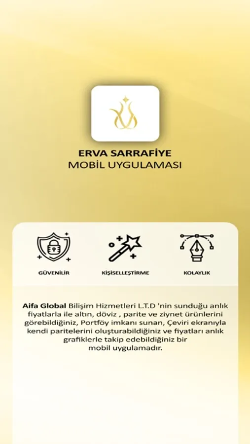 Aifa Global Bilişim Hizmetleri L.T.D 'nin sunduğu anlık fiyatlarla ile altın, döviz, parite ve ziynet ürünlerini görebildiğiniz , Pörtföy imkanı sunan, Çeviri ekranıyla kendi paritelerini oluşturabildiğiniz ve fiyatları anlık grafiklerle takip edebildiğiniz bir mobil uygulamadır.