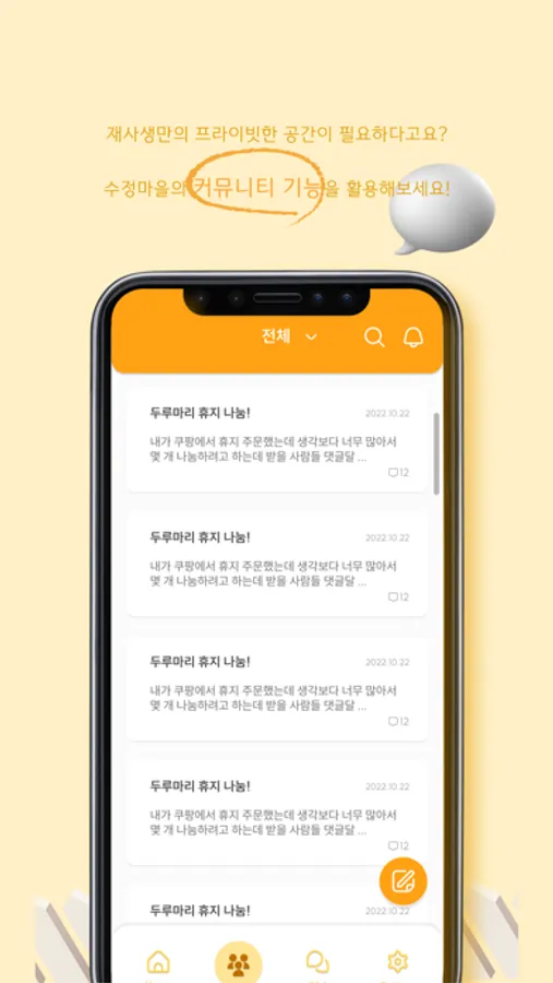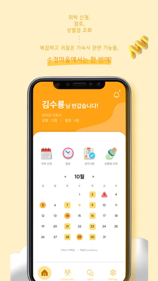 커뮤니티 : 기숙사에 거주하는 재사생과 관리자가 익명으로 자유롭게 소통할 수 있는 커뮤니티 기능을 제공합니다.