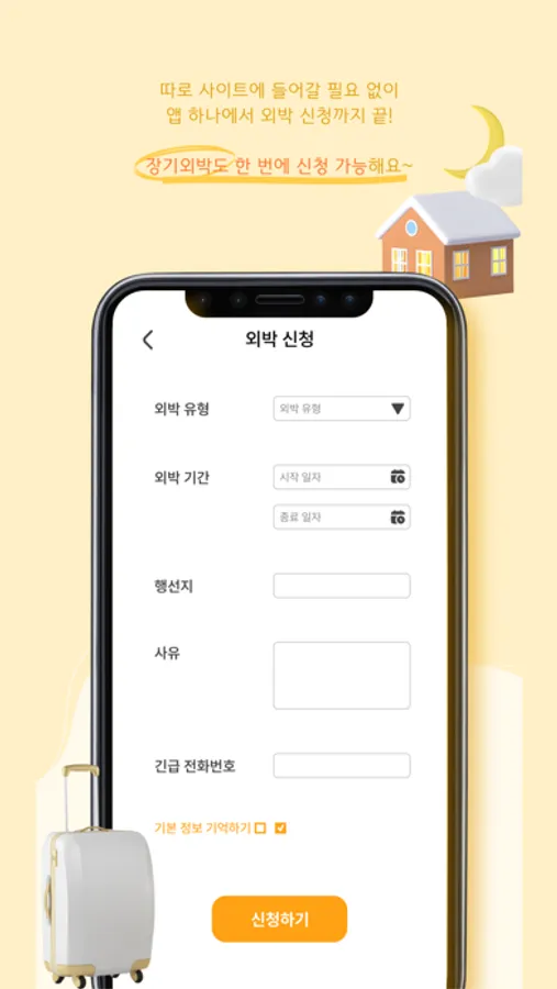 외박 : 외박을 신청하고, 기본 정보 기억하기 기능을 통해 반복적으로 작성되는 항목들을 한번에 작성하세요.