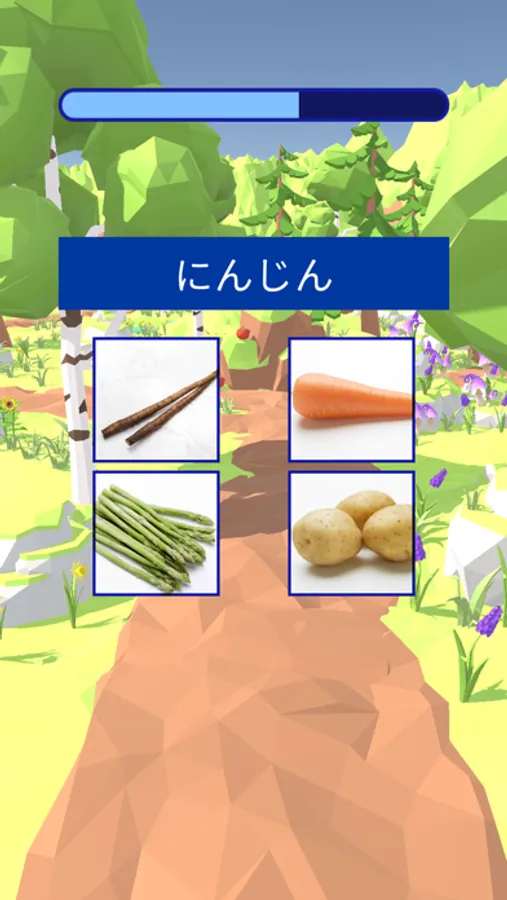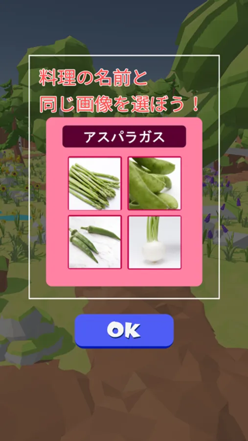 たくさんの野菜が登場します、表示される名前と一致するものを選んでステージクリアを目指そう。