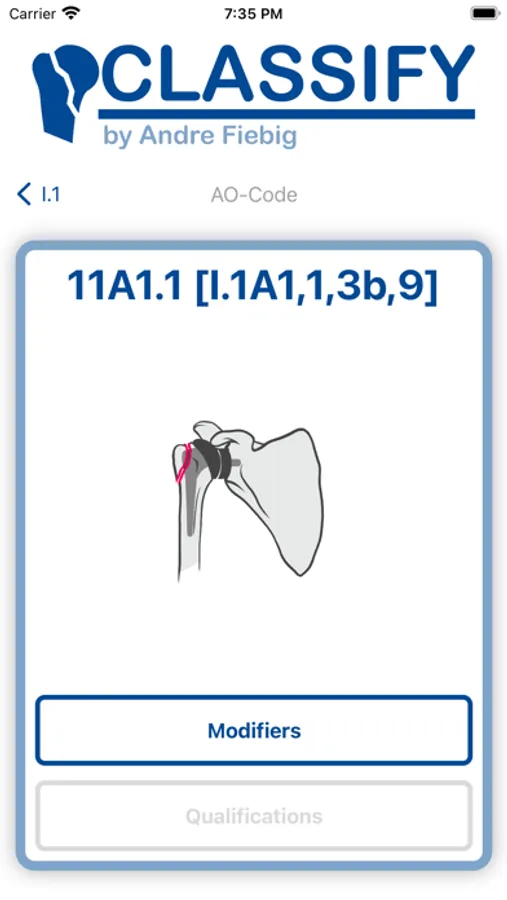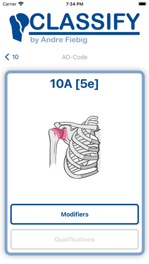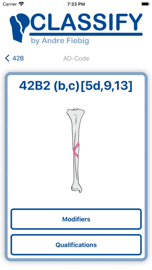 As trauma surgeons we need to classify a lot of fractures every day. So I created this application to easily browse through the body regions and refine the fracture code step by step by just clicking on the fractured body part and selecting the type of fracture - shown as picture and descriptive text. In the end of this process you can precise your classification even more by selecting global modifiers. Furthermore a list of fracture specific "qualifications" (if there are some for the chosen fracture) is presented to you. That way you can easily classify and specify complex fractures.