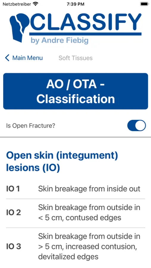 Last but not least there is a classification system for the soft tissue damage in open and closed fractures (AO/OTA-Classification).