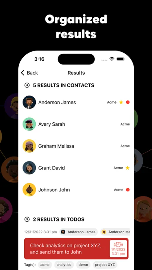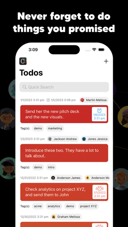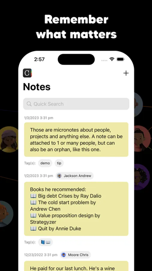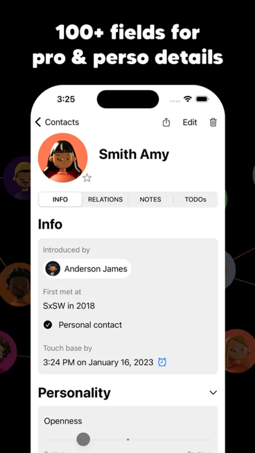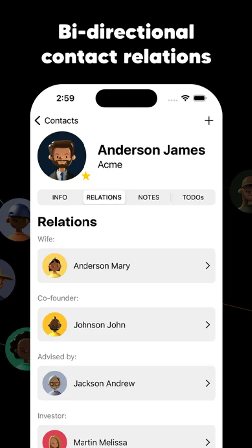 A central location for all your contacts, including more details than any other app, such as physical and personality traits, notes, todos/reminders/action items, and relationships between your contacts, making it easy to manage your personal and professional interactions.