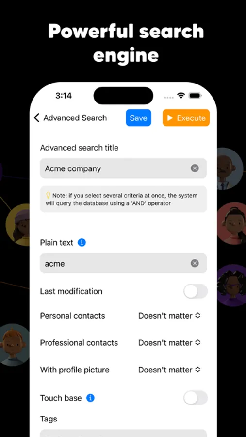 With complex search options that you can save and reuse at any time, Conoto makes keeping track of your relationships a breeze.