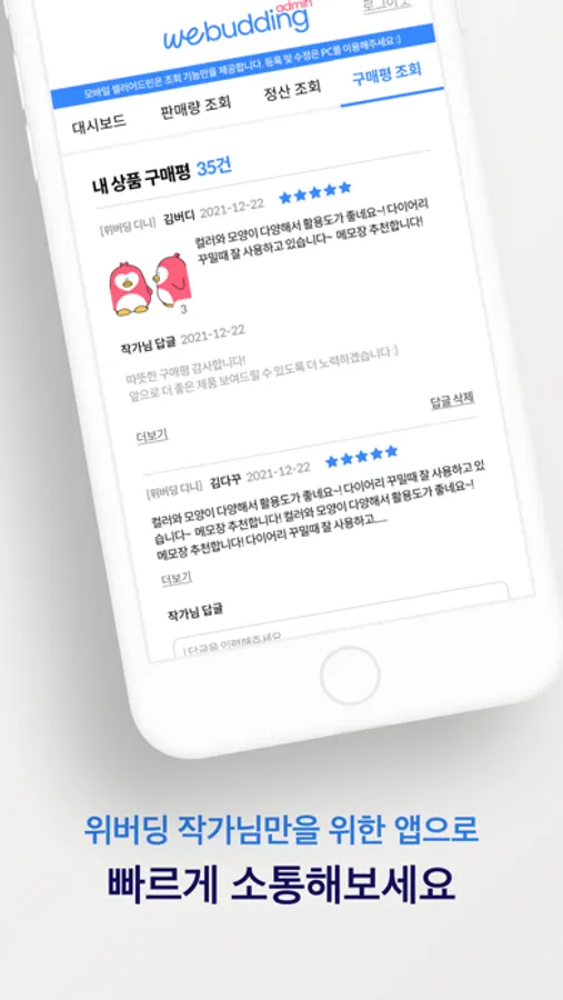 * 위버딩 작가 앱에서는 위버딩 셀러어드민 서비스의 일부 기능이 제공됩니다.