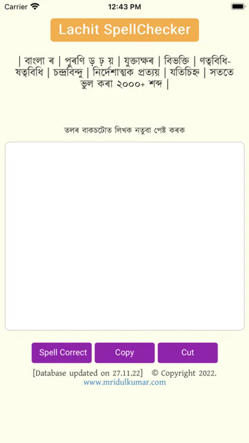Lachit Spell Checker is a utility which corrects spelling mistakes in Assamese Language. Now a days, many people write on their mobiles and here they miss the opportunity to use spellcheckers which are mostly available for computers. This is the reason why we developed this SpellChecker for iOS.