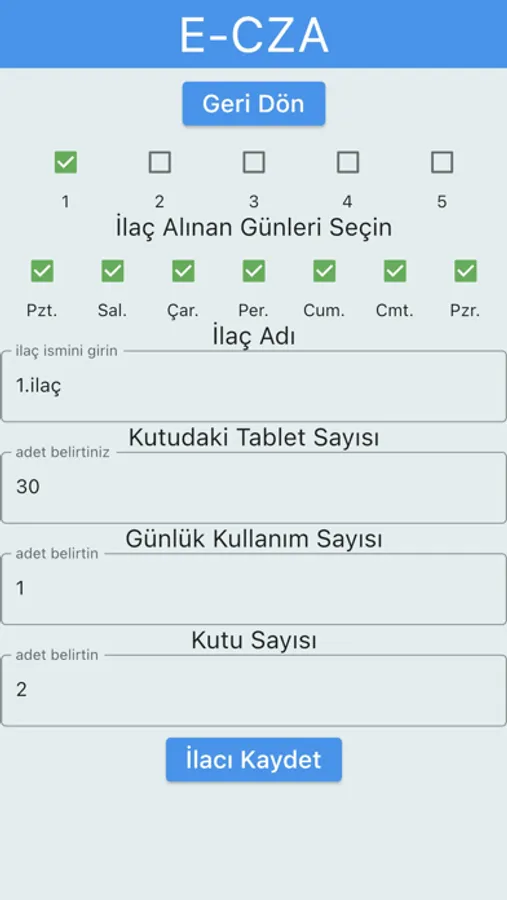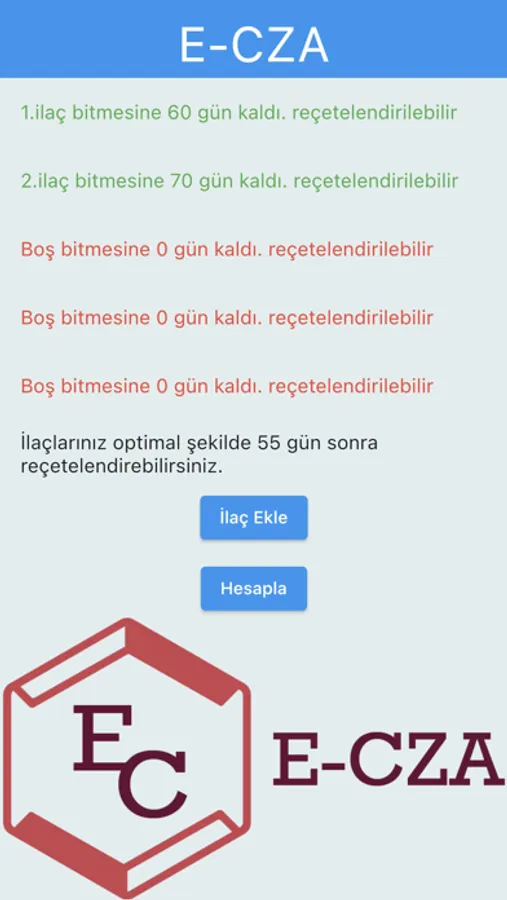 E-CZA uygulaması 5 ilaca kadar kayıt yapabilme özelliğine sahiptir. İlaçlar eklendikten sonra hesaplama butonuna tıklandığında ilaçların reçetelendirilmesi için ortak gün sayısı hesaplanır. (Türkiye için resmi reçetelendirme gün sayısı 15 olarak ayarlanmıştır)