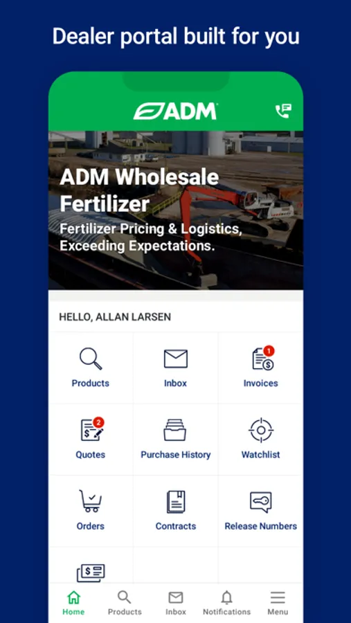 Access all of your business with ADM Wholesale Fertilizer. Find your purchase history, view and pay your invoices, and manage release numbers all in one convenient place.
