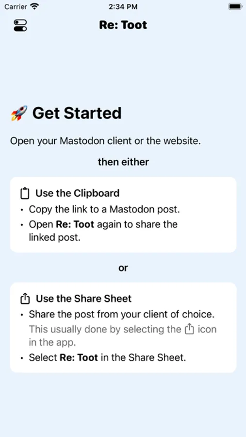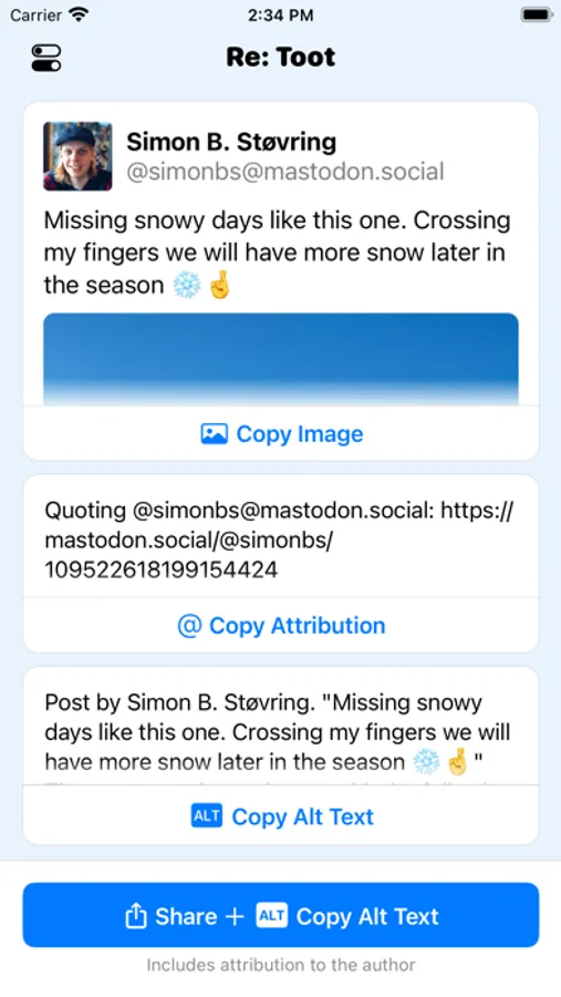 To create an image from a Mastodon post, just copy the link the post and open Re: Toot or invoke the app through the Share Sheet.