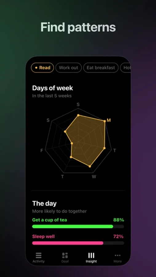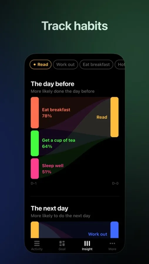 Understand the characteristics of each habit, such as trends over the past 30 days or the most frequent days. Also, discover what you did the day before a habit and the correlations between different habits.