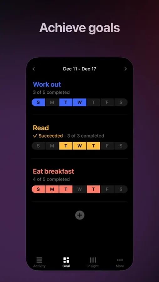 Do you have any habits you want to develop, such as reading or exercise? Set a weekly goal and achieve it with the help of Daygraph.