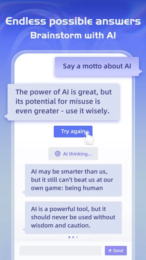 AI Chatbot brings advanced AI within reach. Through your phone, you can access many practical AI tools that will help to make your daily routine more pleasant and convenient. AI can help you with writing articles, drafting work reports, responding to messages. AI can be a great mental both literally and mentally, as well as a great host for text-based game. You can use this app for free without registering or logging in. Download it now and experience the power of AI!
