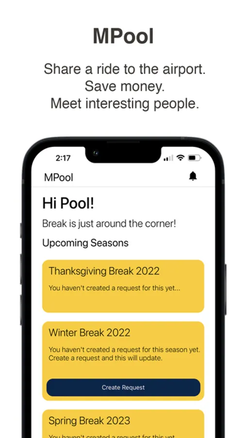 The best way to get from campus to airport or airport to campus. MPool matches you with other students with a similar travel routine so that you can share a ride to the airport together.