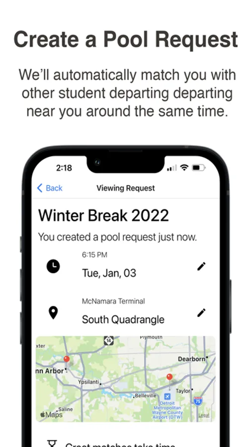 -Create a Pool Request and relax; we'll handle the search for a match for you. Our sophisticated matching algorithm adapts as you get closer to your departure date to ensure you'll find a match. When we find a match, we'll send you a notification.