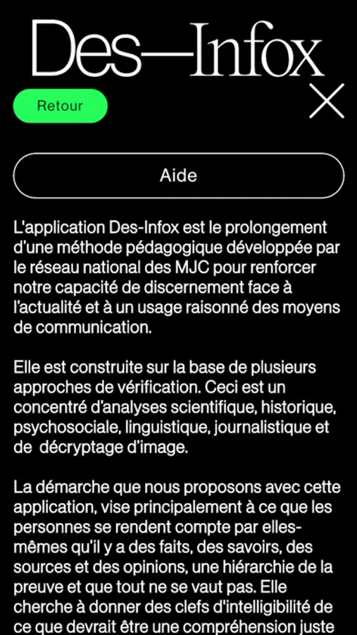 Conçue par le réseau des MJC de France, Des-Infox est une application éducative qui a pour objectif de permettre au plus grand nombre d’acquérir les clefs de compréhension pour traiter une information. En parcourant le chemin pédagogique proposé, vous pourrez vous forger une opinion plus éclairée sur les informations que vous recevez. Ainsi Des-Infox participe à la construction de votre esprit critique. En répondant aux questions posées, vous renforcerez vos capacités de discernement. Petit à petit, les vous disposerez des réflexes mobilisables dans toutes les circonstances pour juger de la crédibilité d’une information.