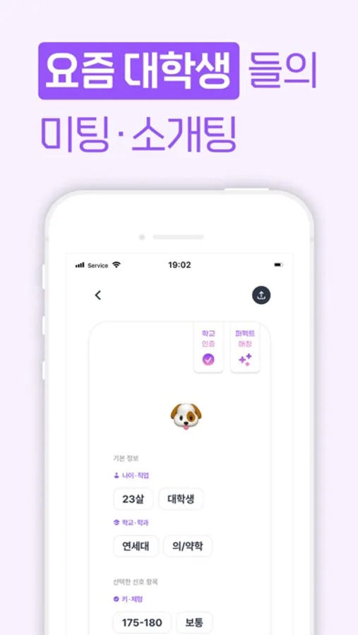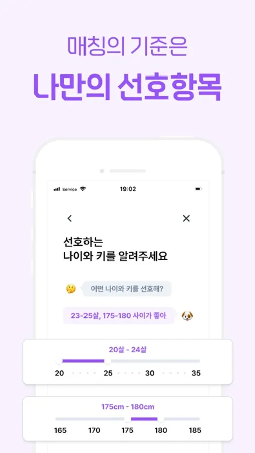 키·나이·학교·지역·MBTI·종교 등의 선호조건을 맞춰줘요!