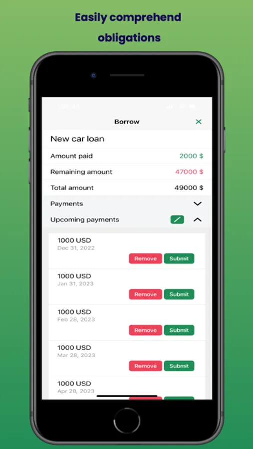 - keep track of money that you borrowed or lent by adding it to your list, then keeping track of how much you returned or received back. It goes with easy to read outlook and charts. Know your situation in a glimpse