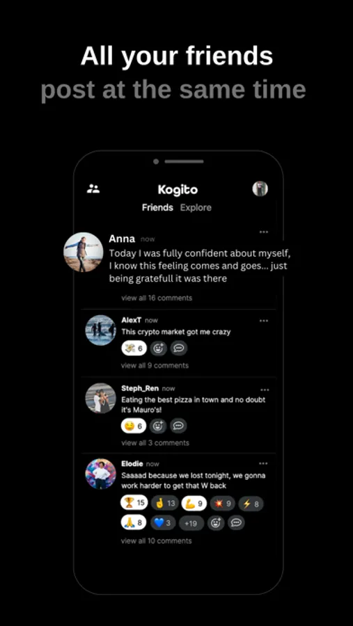 Kogito is a humble social network. It aims at gathering you and your friends by spontaneously sharing your thoughts.