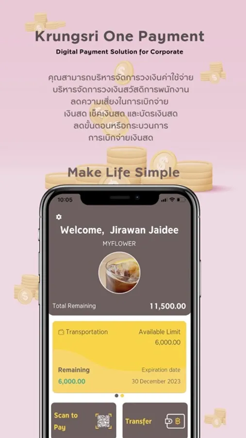 "กรุงศรีวันเพย์เมนท์ เป็นแอปพลิเคชั่น สำหรับบุคลากรในองค์กร เพื่อใช้ในการโอนเงิน สแกนจ่าย หรือกดเงินสดผ่านตู้ โดยการบริหารจัดการวงเงินค่าใช้จ่ายหรือวงเงินสวัสดิการพนักงานผ่านองค์กรเอง ช่วยลดความเสี่ยงในการถือเงินสด, เช็คเงินสด หรือ บัตรเงินสด และช่วยลดขั้นตอนหรือกระบวนการ การเบิกจ่ายเงินสด